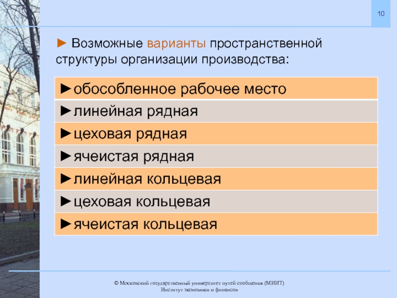Слайд 10► Возможные варианты пространственной структуры организации производства: