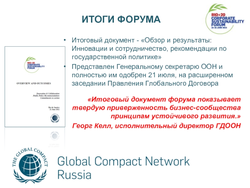 Представлен Генеральному секретарю ООН и полностью им одобрен 21 июля, на расширенном заседании Правления Глобального Договора
