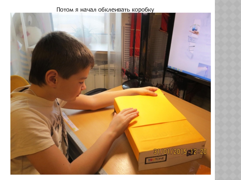 Слайд 7Папа помог мне, обклеив большую часть коробки ярким скотчем