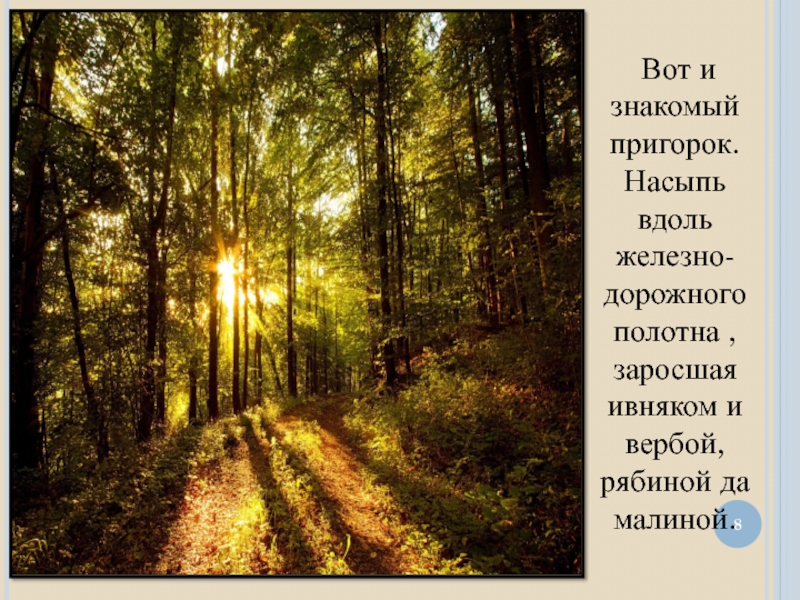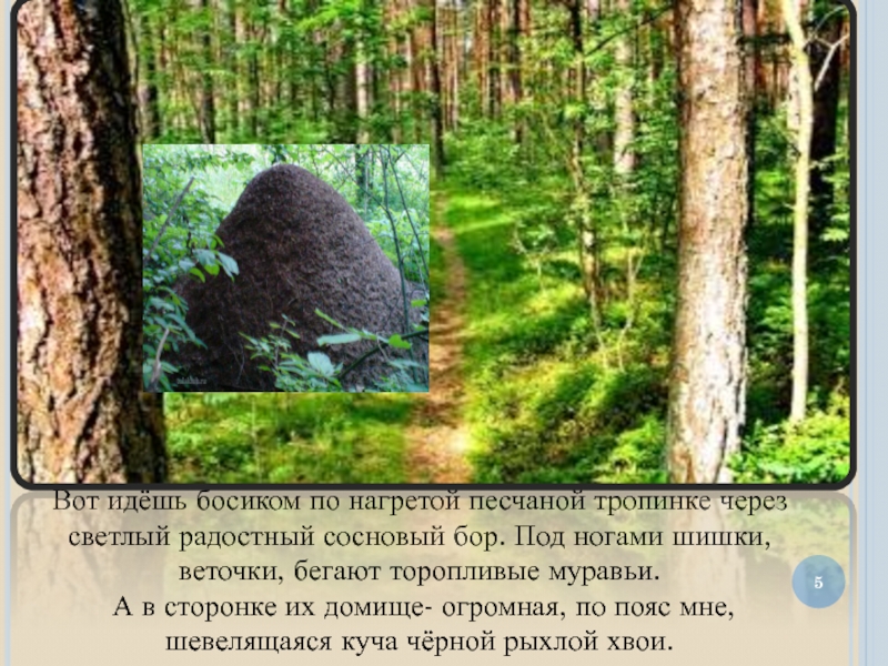 Слайд 5Вот идёшь босиком по нагретой песчаной тропинке через светлый радостный сосновый