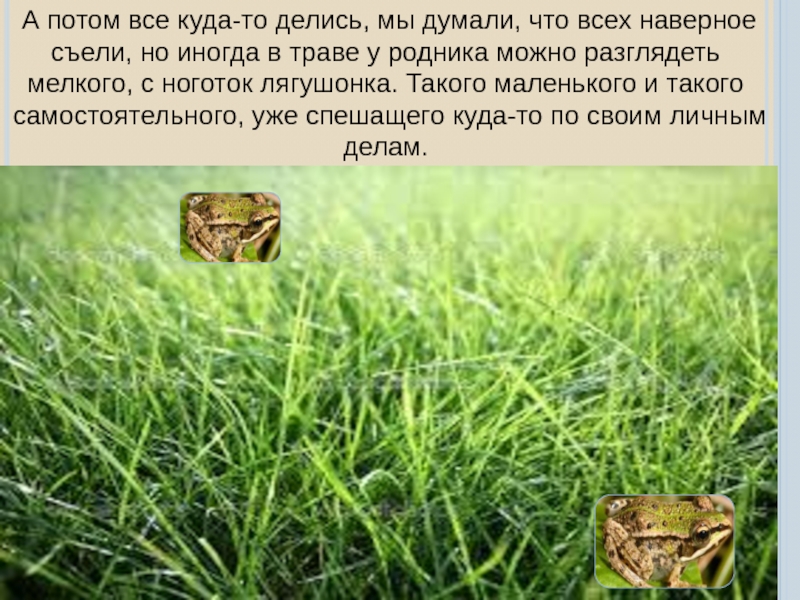 съели, но иногда в траве у родника можно разглядеть мелкого, с ноготок лягушонка. Такого маленького и такого самостоятельного, уже спешащего куда-то по своим личным делам.