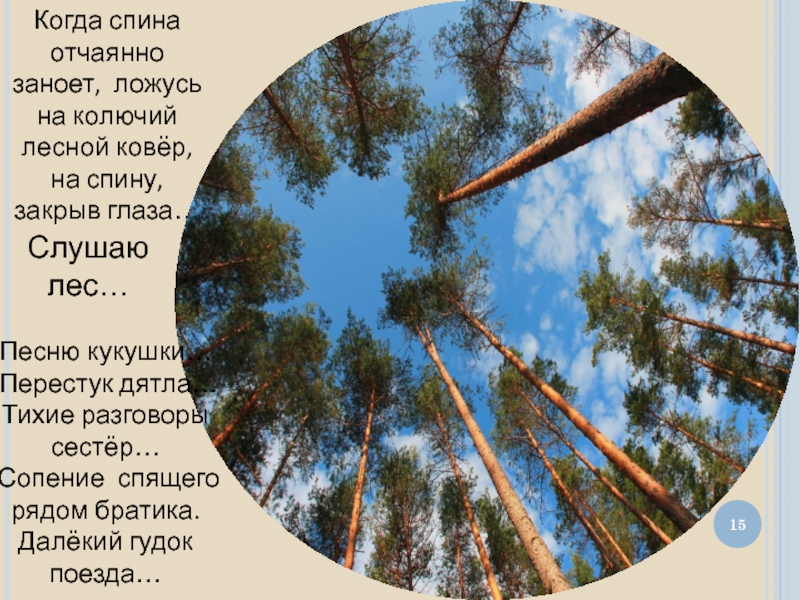 Слайд 15Когда спина отчаянно заноет, ложусь на колючий лесной ковёр, на спину,