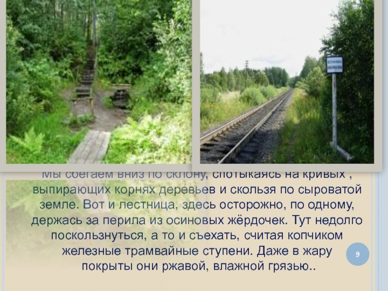 Слайд 9Мы сбегаем вниз по склону, спотыкаясь на кривых , выпирающих корнях