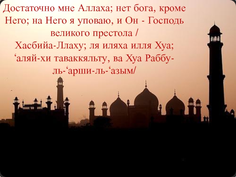 Слайд 22Достаточно мне Аллаха; нет бога, кроме Него; на Него я уповаю,