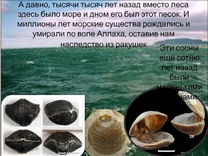 тысяч лет назад вместо леса здесь было море и дном его был этот песок. И миллионы лет морские существа рождались и умирали по воле Аллаха, оставив нам наследство из ракушек