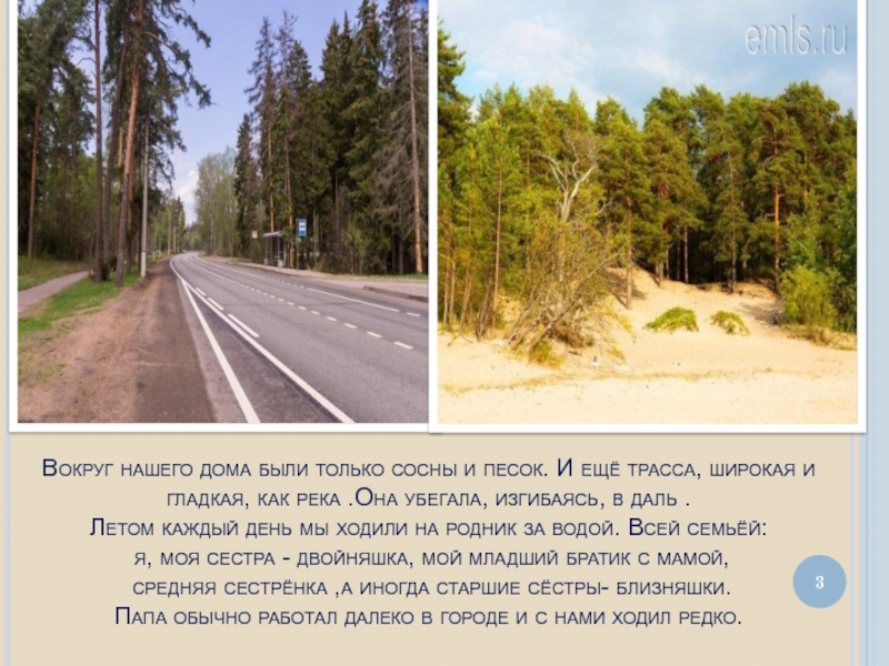 Слайд 3Вокруг нашего дома были только сосны и песок. И ещё трасса,