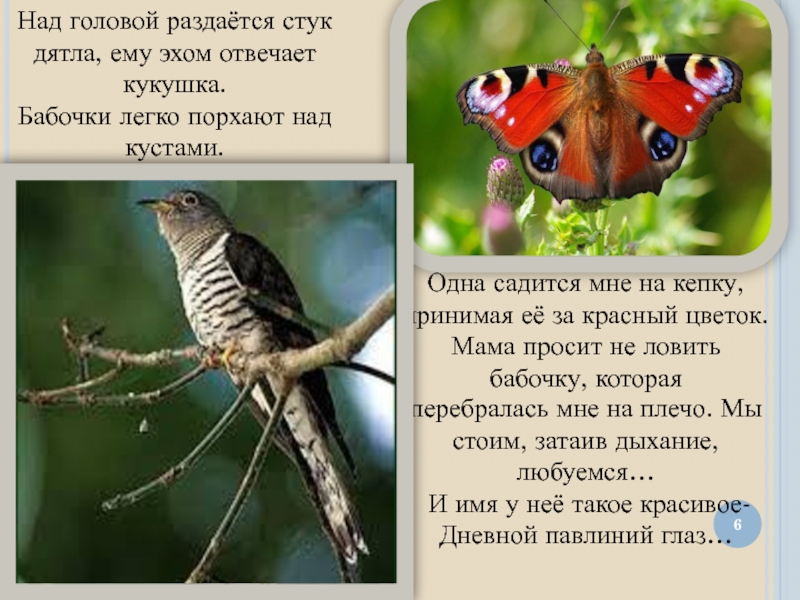 Слайд 6Над головой раздаётся стук дятла, ему эхом отвечает кукушка.