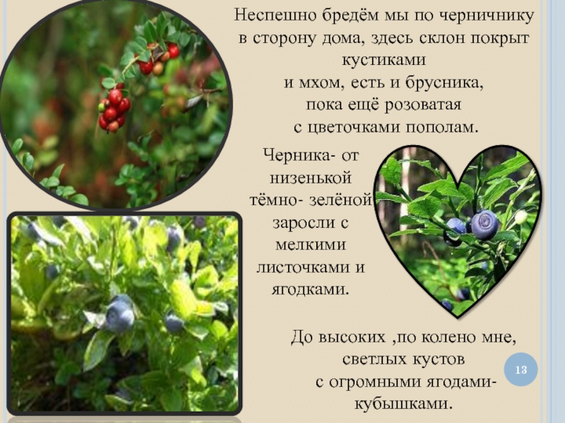 Слайд 13Черника- от низенькой тёмно- зелёной заросли с мелкими листочками и ягодками.