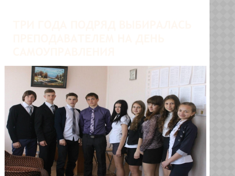 Слайд 9ТРИ ГОДА ПОДРЯД ВЫБИРАЛАСЬ ПРЕПОДАВАТЕЛЕМ НА ДЕНЬ САМОУПРАВЛЕНИЯ