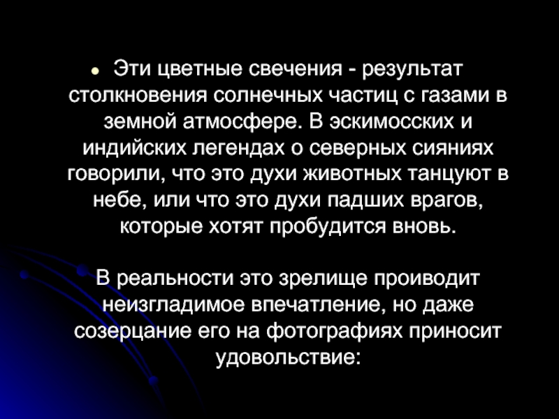 земной атмосфере. В эскимосских и индийских легендах о северных сияниях говорили, что это духи животных танцуют в небе, или что это духи падших врагов, которые хотят пробудится вновь. В реальности это зрелище проиводит неизгладимое впечатление, но даже созерцание его на фотографиях приносит удовольствие: