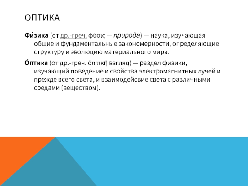 О́птика (от др.-греч. ὀπτική взгляд) — раздел физики, изучающий поведение и свойства электромагнитных лучей и прежде всего света, и взаимодейсвие света с различными средами (веществом).