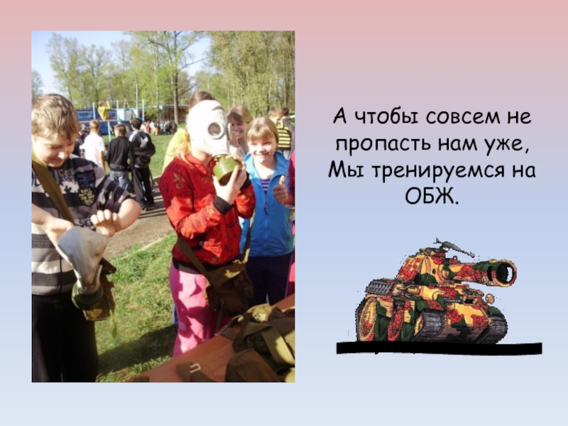 Слайд 14А чтобы совсем не пропасть нам уже, Мы тренируемся на ОБЖ.