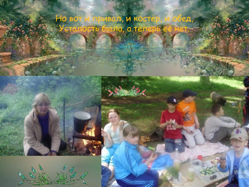Слайд 16Но вот и привал, и костёр, и обед, Усталость была, а теперь
