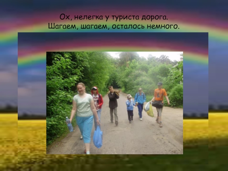 Слайд 15Ох, нелегка у туриста дорога. Шагаем, шагаем, осталось немного.
