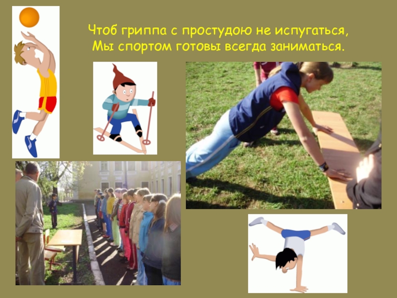 Слайд 13Чтоб гриппа с простудою не испугаться, Мы спортом готовы всегда заниматься.