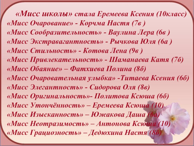 Слайд 9 «Мисс школы» стала Еремеева Ксения (10класс)