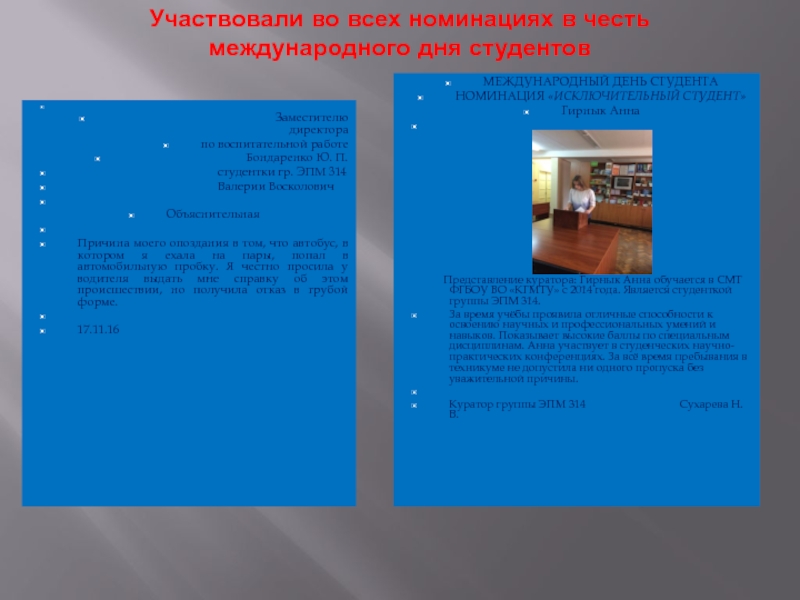 За время учёбы проявила отличные способности к освоению научных и профессиональных умений и навыков. Показывает высокие баллы по специальным дисциплинам. Анна участвует в студенческих научно-практических конференциях. За всё время пребывания в техникуме не допустила ни одного пропуска без уважительной причины.