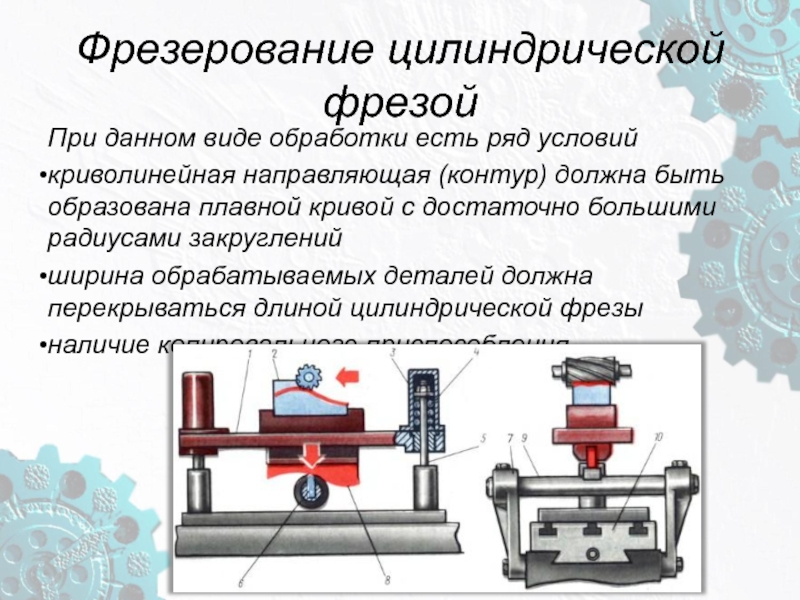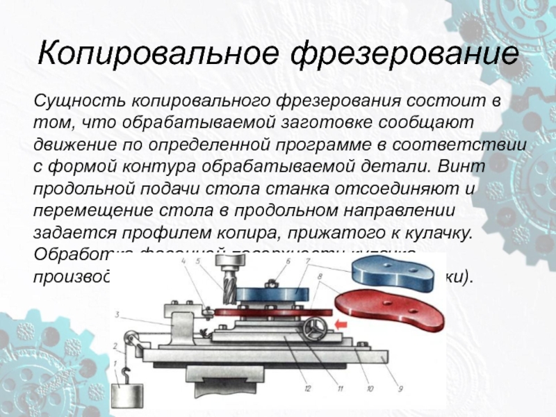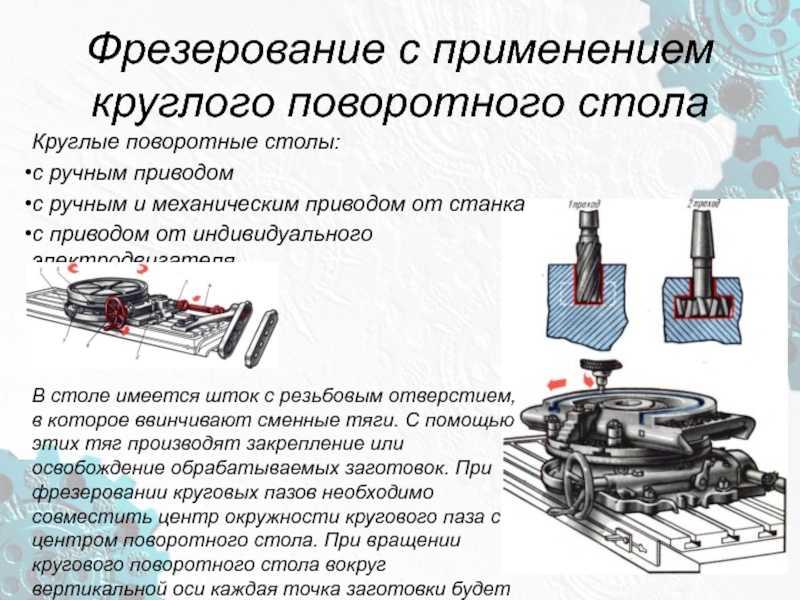 В столе имеется шток с резьбовым отверстием, в которое ввинчивают сменные тяги. С помощью этих тяг производят закрепление или освобождение обрабатываемых заготовок. При фрезеровании круговых пазов необходимо совместить центр окружности кругового паза с центром поворотного стола. При вращении кругового поворотного стола вокруг вертикальной оси каждая точка заготовки будет перемещаться по окружности радиусом, равным расстоянию этой точки от центра стола.