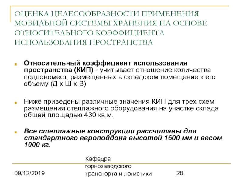 Относительный коэффициент использования пространства (КИП) - учитывает отношение количества поддономест, размещенных в складском помещение к его объему (Д х Ш х В)