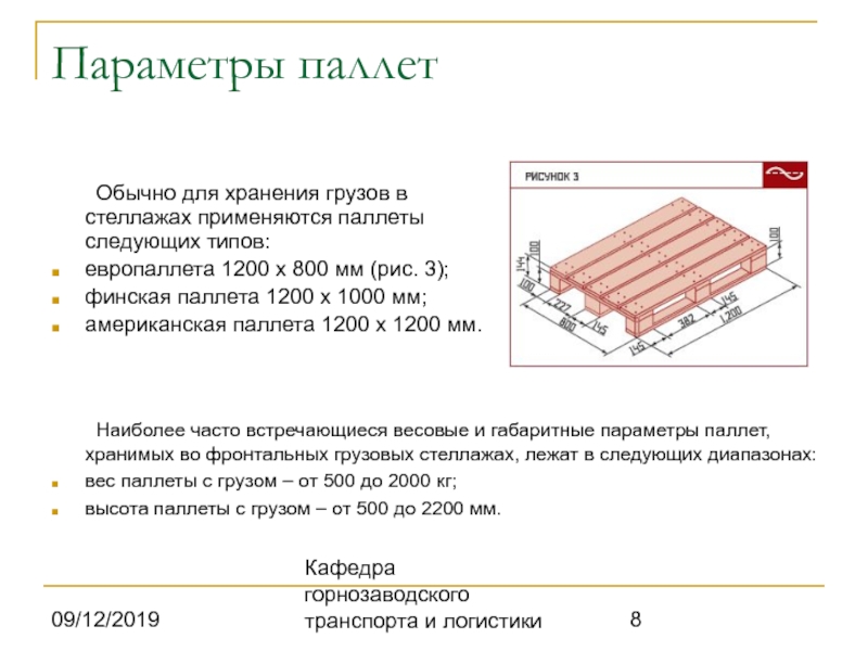 Наиболее часто встречающиеся весовые и габаритные параметры паллет, хранимых во фронтальных грузовых стеллажах, лежат в следующих диапазонах: