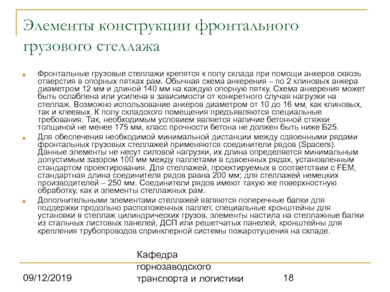 крепятся к полу склада при помощи анкеров сквозь отверстия в опорных пятках рам. Обычная схема анкерения – по 2 клиновых анкера диаметром 12 мм и длиной 140 мм на каждую опорную пятку. Схема анкерения может быть ослаблена или усилена в зависимости от конкретного случая нагрузки на стеллаж. Возможно использование анкеров диаметром от 10 до 16 мм, как клиновых, так и клеевых. К полу складского помещения предъявляются специальные требования. Так, необходимым условием является наличие бетонной стяжки толщиной не менее 175 мм, класс прочности бетона не должен быть ниже Б25.