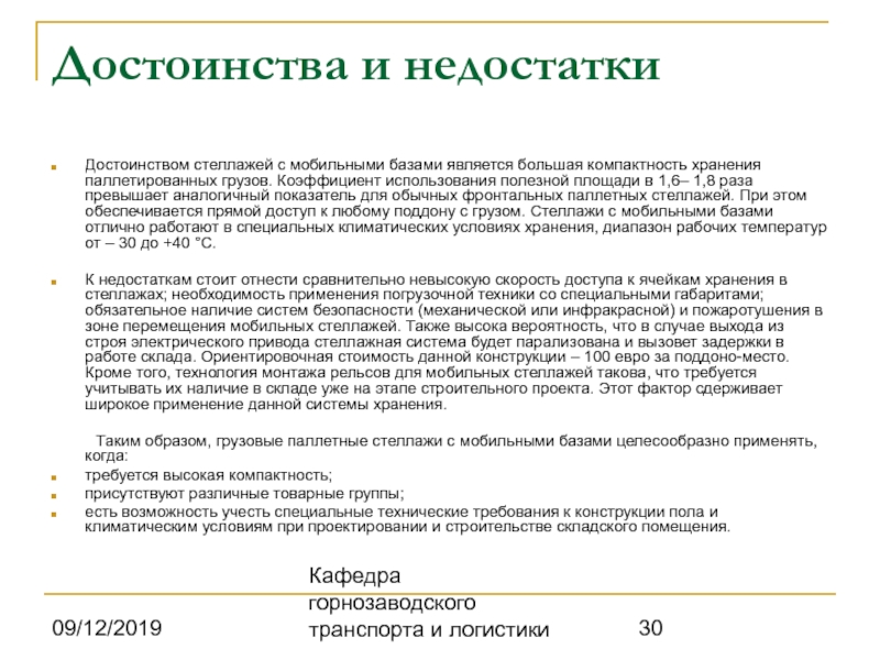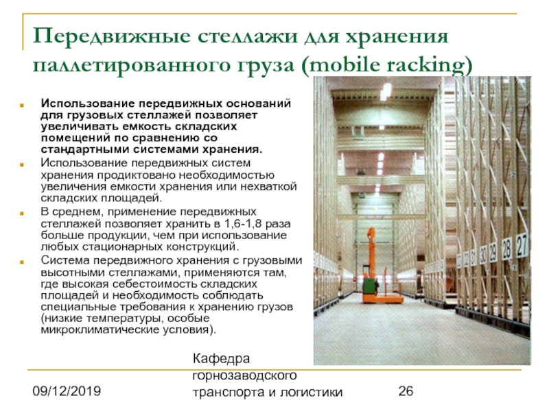 является большая компактность хранения паллетированных грузов. Коэффициент использования полезной площади в 1,6– 1,8 раза превышает аналогичный показатель для обычных фронтальных паллетных стеллажей. При этом обеспечивается прямой доступ к любому поддону с грузом. Стеллажи с мобильными базами отлично работают в специальных климатических условиях хранения, диапазон рабочих температур от – 30 до +40 °С.