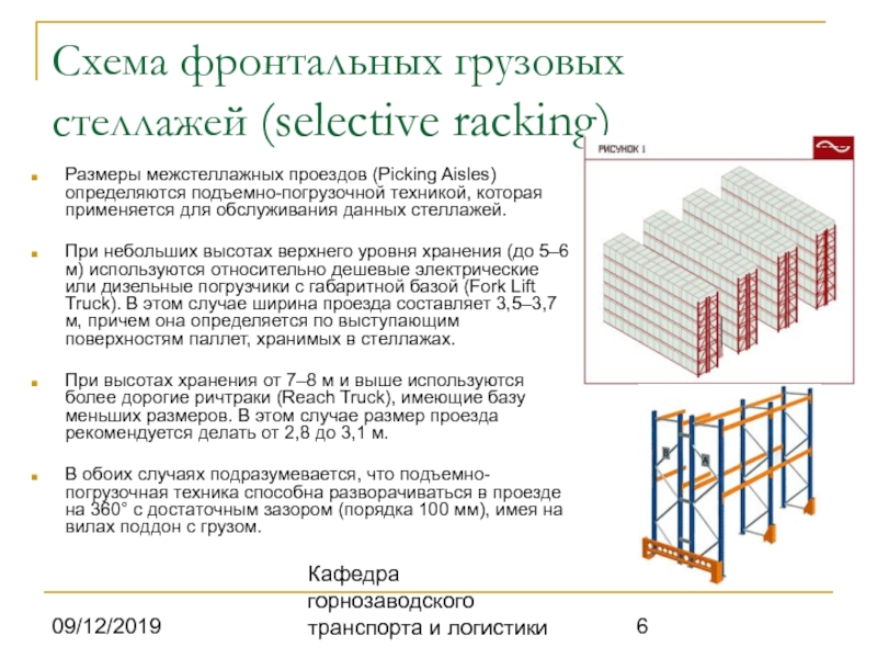 При небольших высотах верхнего уровня хранения (до 5–6 м) используются относительно дешевые электрические или дизельные погрузчики с габаритной базой (Fork Lift Truck). В этом случае ширина проезда составляет 3,5–3,7 м, причем она определяется по выступающим поверхностям паллет, хранимых в стеллажах.