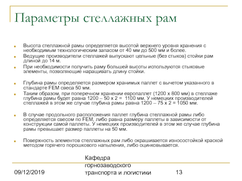 Параметры стеллажных рам