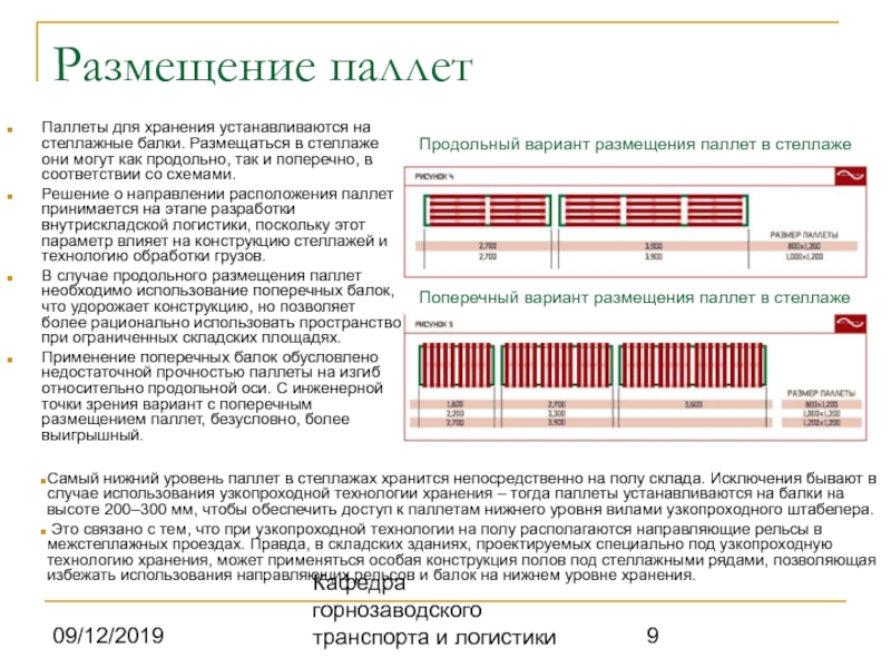 В обоих случаях подразумевается, что подъемно-погрузочная техника способна разворачиваться в проезде на 360° с достаточным зазором (порядка 100 мм), имея на вилах поддон с грузом.