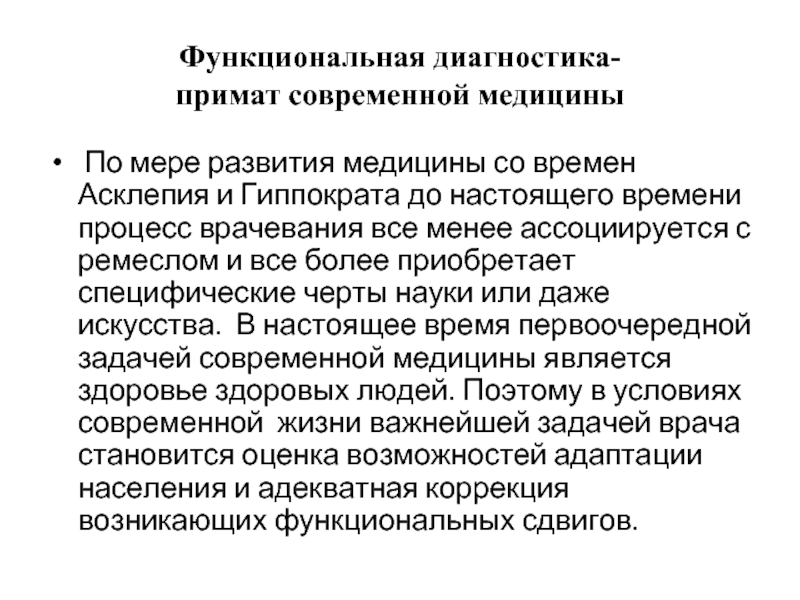 и Гиппократа до настоящего времени процесс врачевания все менее ассоциируется с ремеслом и все более приобретает специфические черты науки или даже искусства. В настоящее время первоочередной задачей современной медицины является здоровье здоровых людей. Поэтому в условиях современной жизни важнейшей задачей врача становится оценка возможностей адаптации населения и адекватная коррекция возникающих функциональных сдвигов.