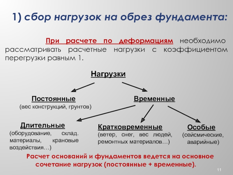 Расчет оснований и фундаментов ведется на основное сочетание нагрузок (постоянные + временные).