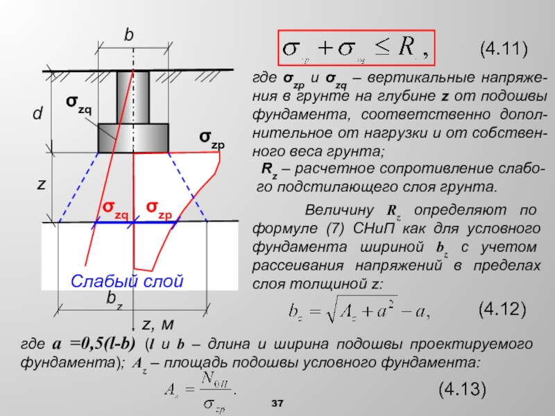 Если на глубине z от подошвы фундамента находится слой грунта меньшей прочности, необходимо, чтобы обеспечивалось следующее условие: