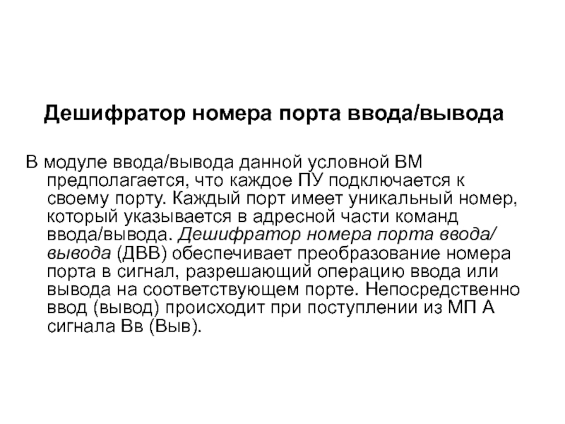 каждое ПУ подключается к своему порту. Каждый порт имеет уникальный номер, который указывается в адресной части команд ввода/вывода. Дешифратор номера порта ввода/ вывода (ДВВ) обеспечивает преобразование номера порта в сигнал, разрешающий операцию ввода или вывода на соответствующем порте. Непосредственно ввод (вывод) происходит при поступлении из МП А сигнала Вв (Выв).