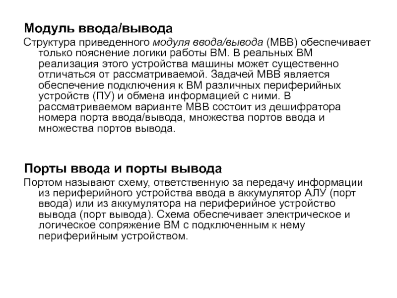 Структура приведенного модуля ввода/вывода (МВВ) обеспечивает только пояснение логики работы