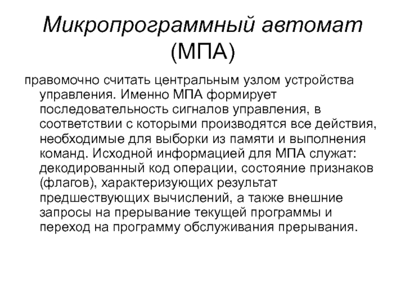 последовательность сигналов управления, в соответствии с которыми производятся все действия, необходимые для выборки из памяти и выполнения команд. Исходной информацией для МПА служат: декодированный код операции, состояние признаков (флагов), характеризующих результат предшествующих вычислений, а также внешние запросы на прерывание текущей программы и переход на программу обслуживания прерывания.