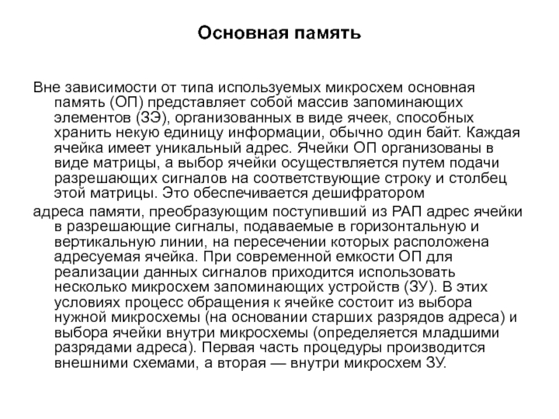 адреса памяти, преобразующим поступивший из РАП адрес ячейки в разрешающие сигналы, подаваемые в горизонтальную и вертикальную линии, на пересечении которых расположена адресуемая ячейка. При современной емкости ОП для реализации данных сигналов приходится использовать несколько микросхем запоминающих устройств (ЗУ). В этих условиях процесс обращения к ячейке состоит из выбора нужной микросхемы (на основании старших разрядов адреса) и выбора ячейки внутри микросхемы (определяется младшими разрядами адреса). Первая часть процедуры производится внешними схемами, а вторая — внутри микросхем ЗУ.