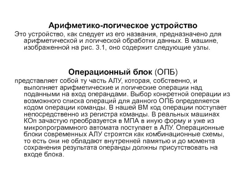 представляет собой ту часть АЛУ, которая, собственно, и выполняет арифметические и логические операции над поданными на вход операндами. Выбор конкретной операции из возможного списка операций для данного ОПБ определяется кодом операции команды. В нашей ВМ код операции поступает непосредственно из регистра команды. В реальных машинах КОп зачастую преобразуется в МПА в иную форму и уже из микропрограммного автомата поступает в АЛУ. Операционные блоки современных АЛУ строятся как комбинационные схемы, то есть они не обладают внутренней памятью и до момента сохранения результата операнды должны присутствовать на входе блока.