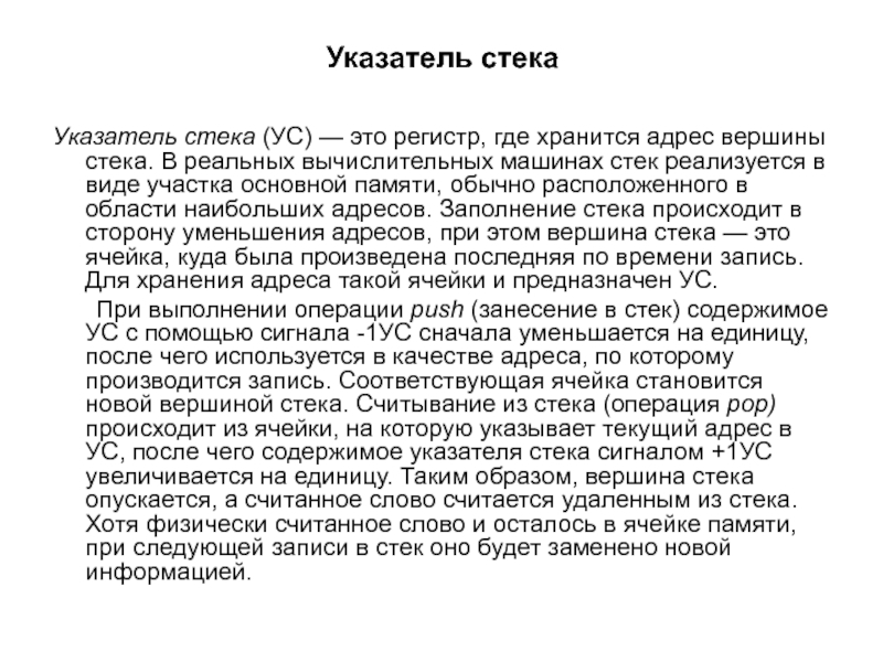 Указатель стека (УС) — это регистр, где хранится адрес вершины