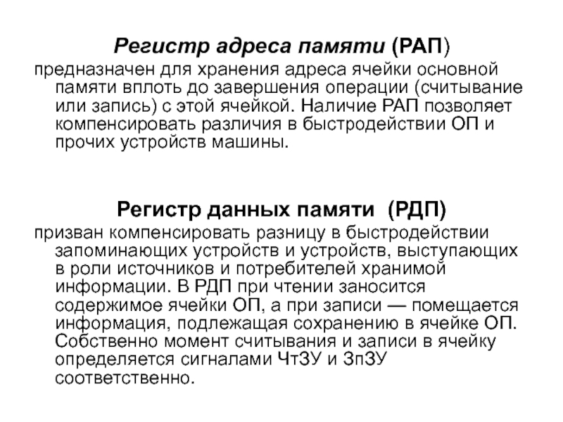 вплоть до завершения операции (считывание или запись) с этой ячейкой. Наличие РАП позволяет компенсировать различия в быстродействии ОП и прочих устройств машины.