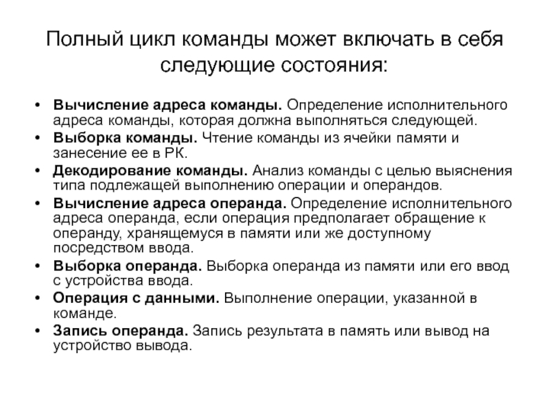 Слайд 4Полный цикл команды может включать в себя следующие состояния: