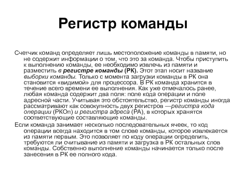 содержит информации о том, что это за команда. Чтобы приступить к выполнению команды, ее необходимо извлечь из памяти и разместить в регистре команды (РК). Этот этап носит название выборки команды. Только с момента загрузки команды в РК она становится «видимой» для процессора. В РК команда хранится в течение всего времени ее выполнения. Как уже отмечалось ранее, любая команда содержит два поля: поле кода операции и поле адресной части. Учитывая это обстоятельство, регистр команды иногда рассматривают как совокупность двух регистров —регистра кода операции (РКОп) и регистра адреса (РА), в которых хранятся соответствующие составляющие команды.