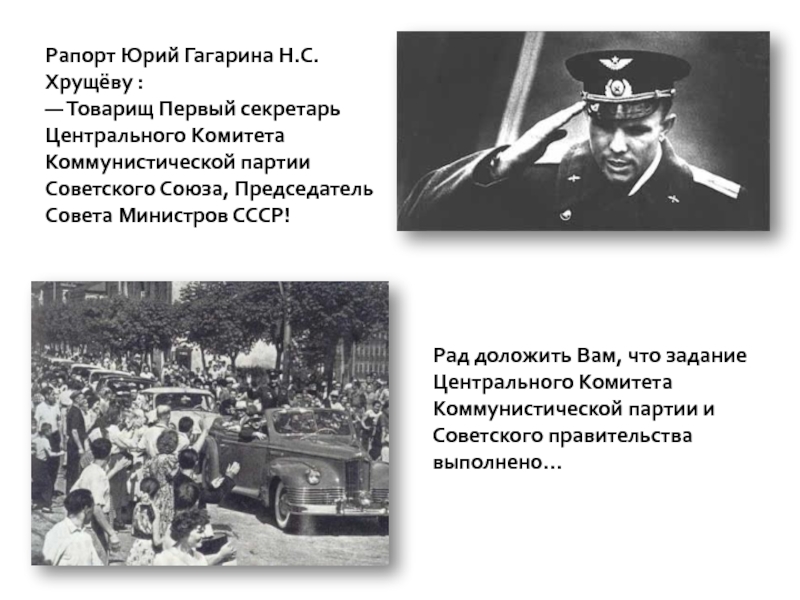 Рад доложить Вам, что задание Центрального Комитета Коммунистической партии и Советского правительства выполнено…
