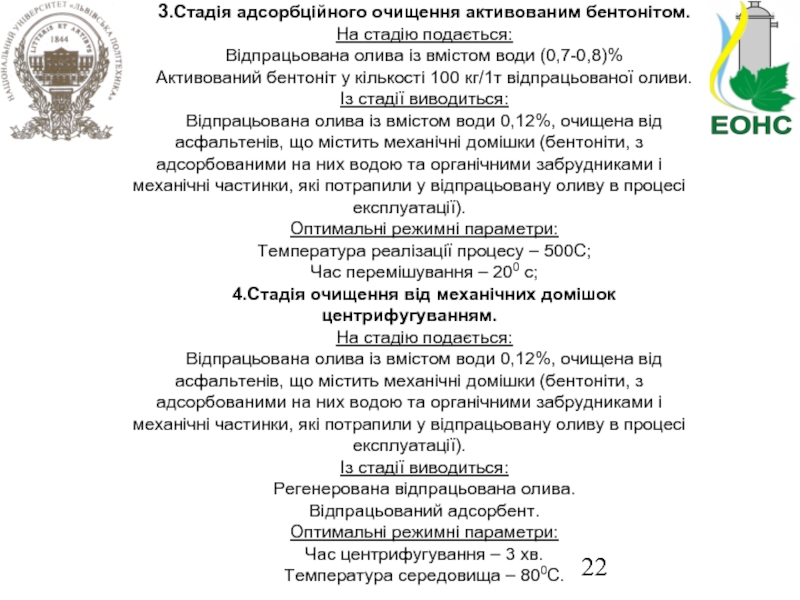 Слайд 223.Стадія адсорбційного очищення активованим бентонітом.