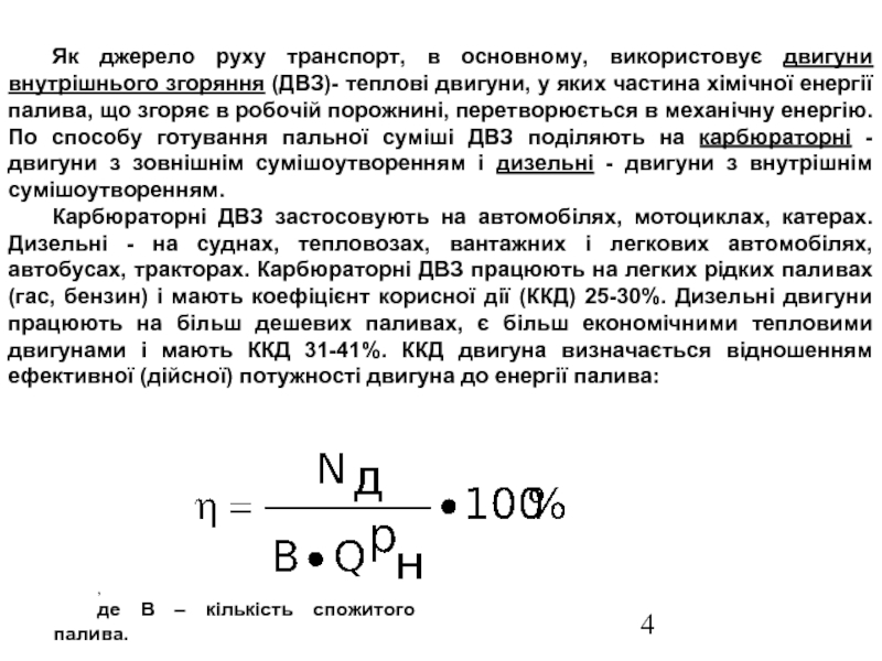 Слайд 4Як джерело руху транспорт, в основному, використовує двигуни внутрішнього згоряння (ДВЗ)-
