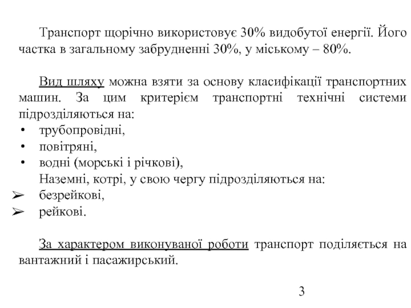 Слайд 3Транспорт щорічно використовує 30% видобутої енергії. Його частка в загальному забрудненні