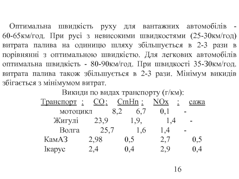 Слайд 16Оптимальна швидкість руху для вантажних автомобілів - 60-65км/год. При русі з