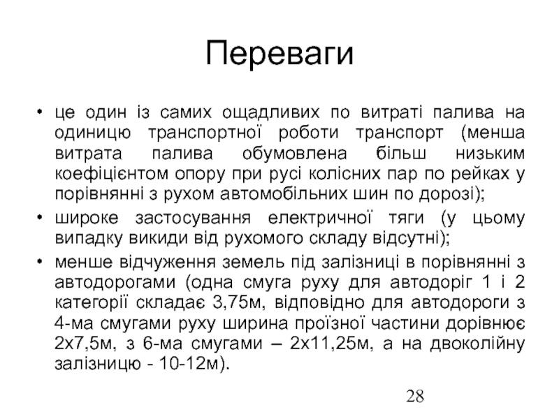 менше відчуження земель під залізниці в порівнянні з автодорогами (одна смуга руху для автодоріг 1 і 2 категорії складає 3,75м, відповідно для автодороги з 4-ма смугами руху ширина проїзної частини дорівнює 2х7,5м, з 6-ма смугами – 2х11,25м, а на двоколійну залізницю - 10-12м).