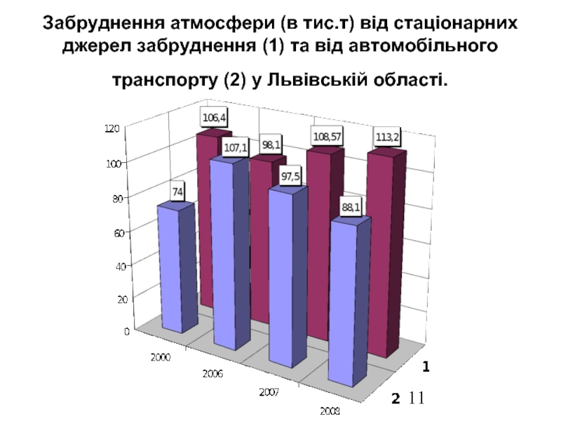Слайд 11Забруднення атмосфери (в тис.т) від стаціонарних джерел забруднення (1) та від