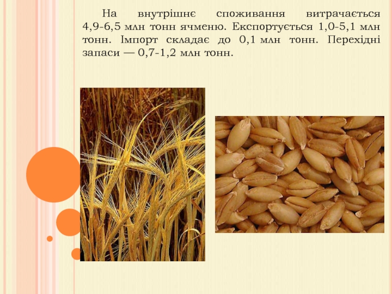 Слайд 5 На внутрішнє споживання витрачається 4,9-6,5 млн тонн ячменю. Експортується 1,0-5,1 млн тонн. Імпорт