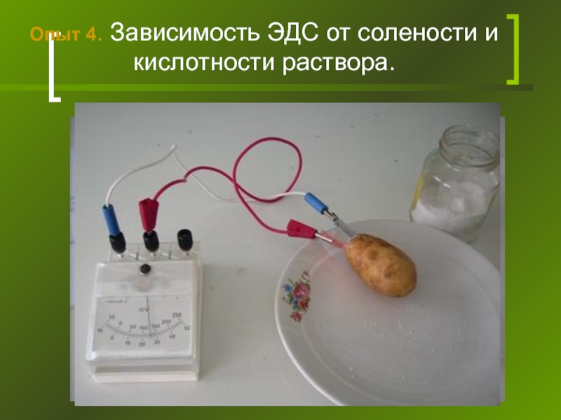 Слайд 17Опыт 4. Зависимость ЭДС от солености и кислотности раствора.
